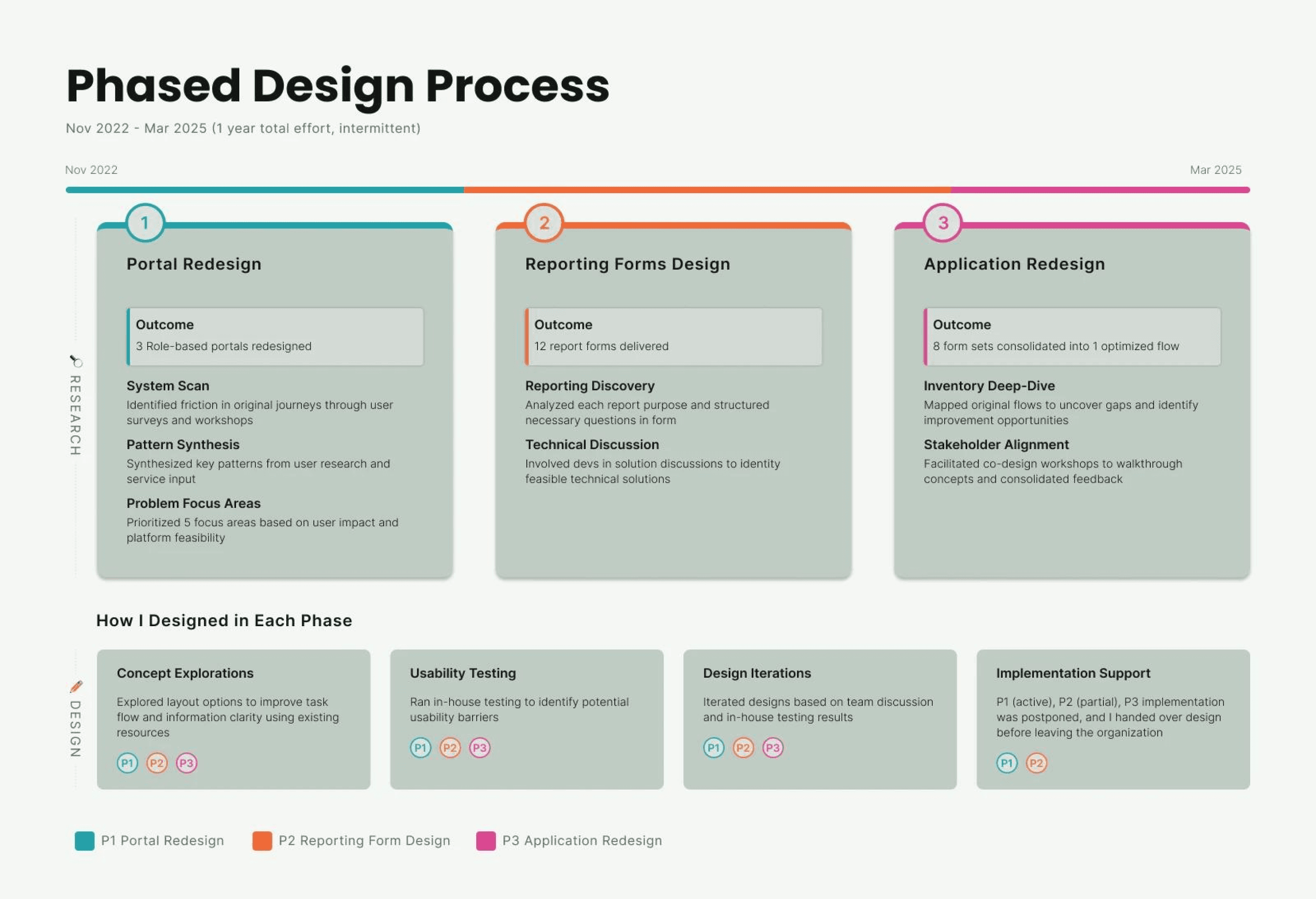 My contribution spanned three phased efforts - portals redesign, reporting forms design, and application redesign, all of these were delivered incrementally over the course of the project.